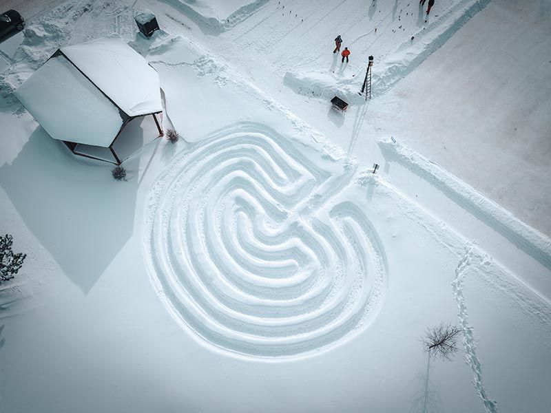 A meditation labyrinth is a spiral walking path. Typically created outdoors, it can be made out of grasses, stone, or herbs among other natural things. The Ely Winter Festival Snow Labyrinth created by Tranquility Wellness Center owner, Jaime Brennan, and volunteers, as you might guess, this time of year is made out of snow. It is similar to a maze but with no wrong turns, one enters the single-line path and walks to the center then back out again. The Tranquility Snow Labyrinth is available to walk while the park is open.