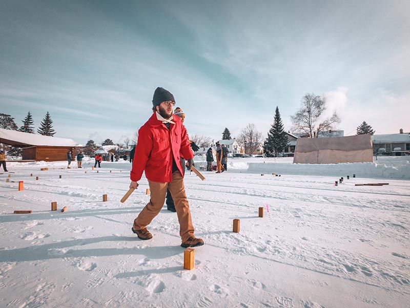 Dave Wigdahl, our local Kubb guru, describes it as Swedish lawn-bowling that has been modified for play on snow. It’s also sometimes called Viking chess, presumably without the bloodshed and horned helmets. There is quite a lot of tossing about of various carved pieces of wood that represent a king and other chess-like characters in an effort to knock over the other team’s wooden “men.” Finesse and technique are preferable to muscle-bound hurling of flying objects.